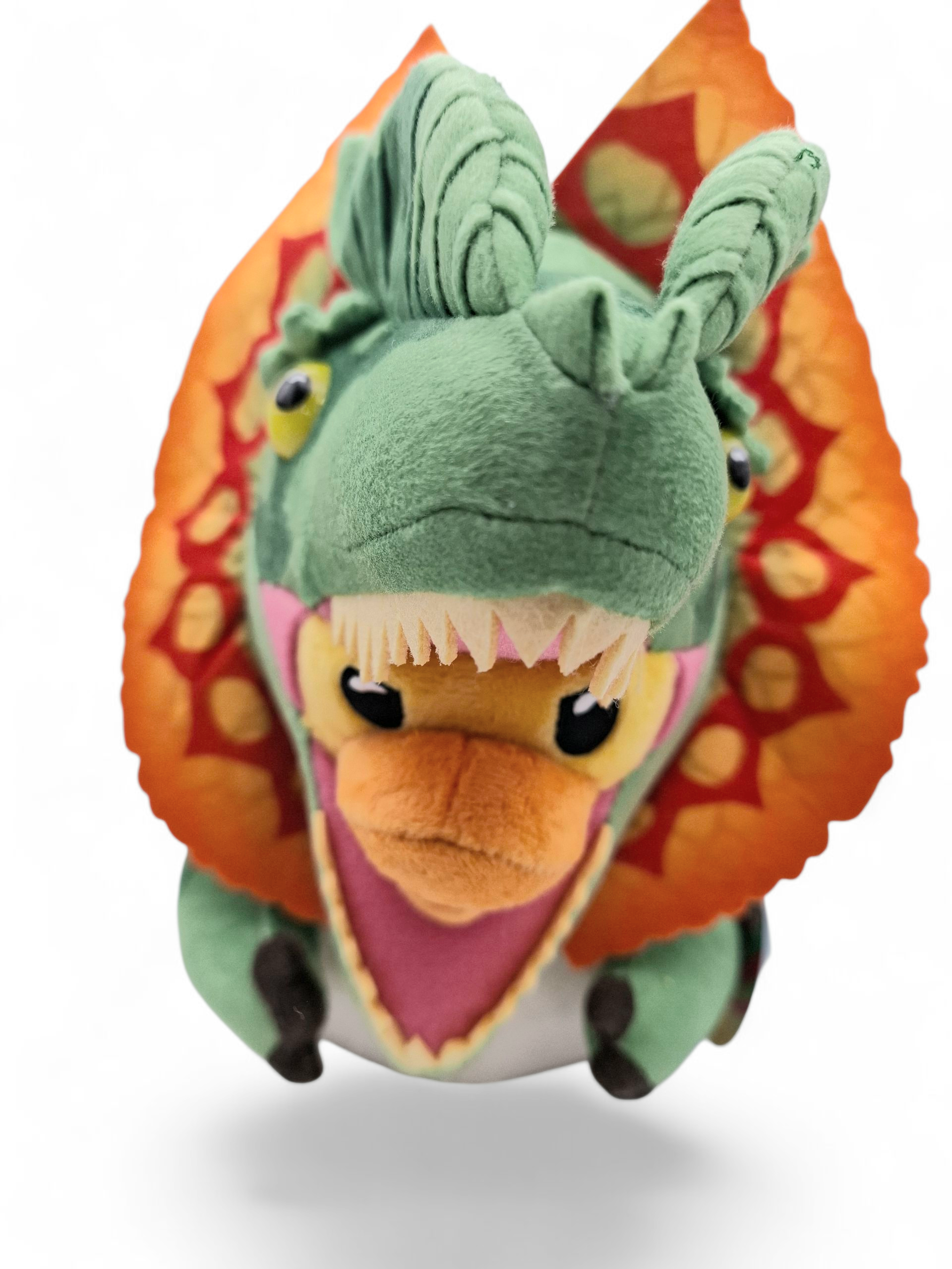 Featuring detailed design elements inspired by the Dilophosaurus from the original Jurassic Park movie — including its signature colorful frill and mischievous grin — this plush captures the spirit of the creature in a soft, squeezable form. Crafted from premium materials, the TUBBZ Dilophosaurus Plush is perfect for both cuddling and display.