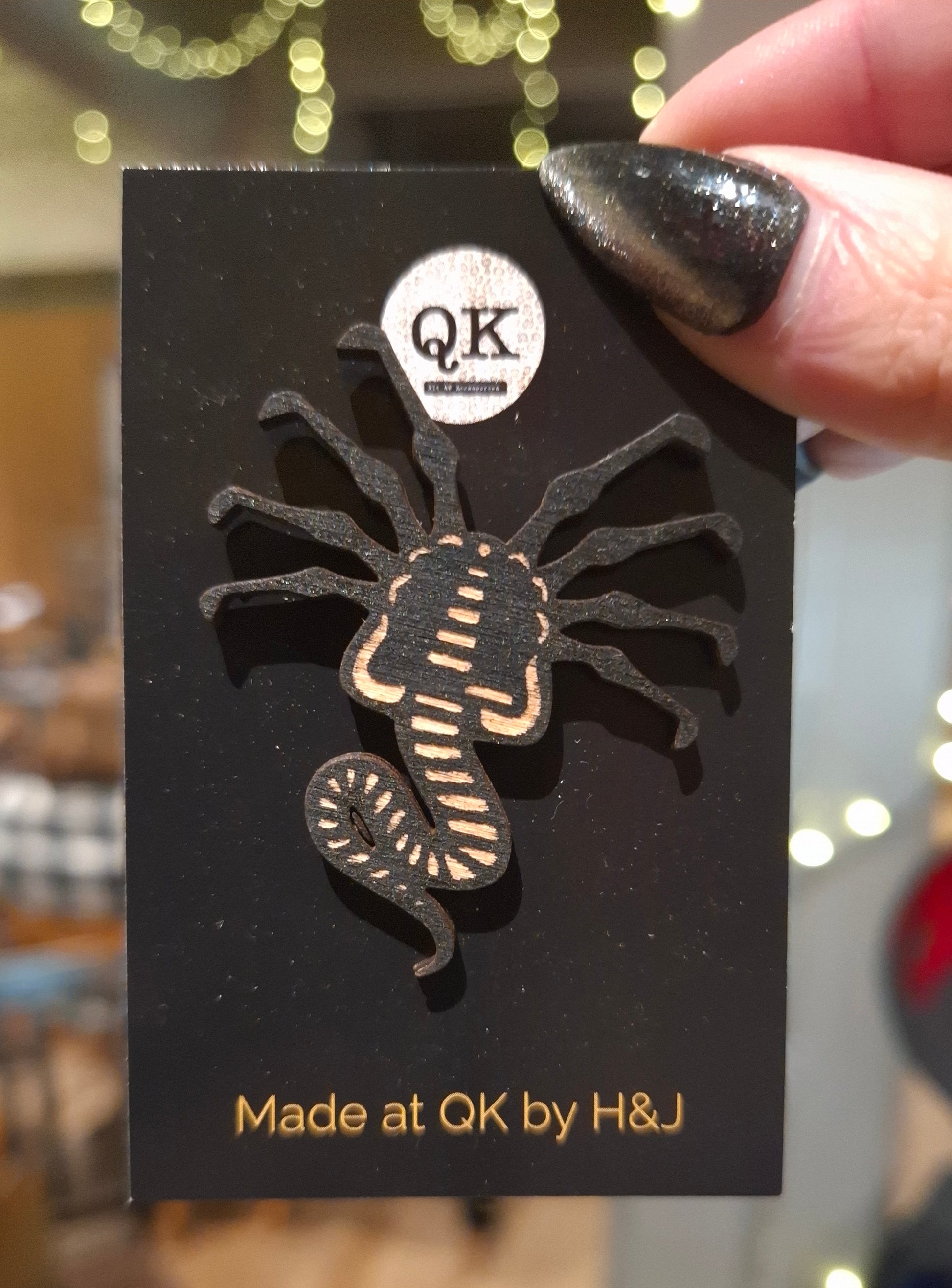 Enhance your collection with the Face Hugger Pin Badge by QK. Crafted from high-quality wood and measuring at 3.5cm, this engraved badge is a must-have for horror fans. Add a touch of terror to your wardrobe and show off your expertise in the genre.
