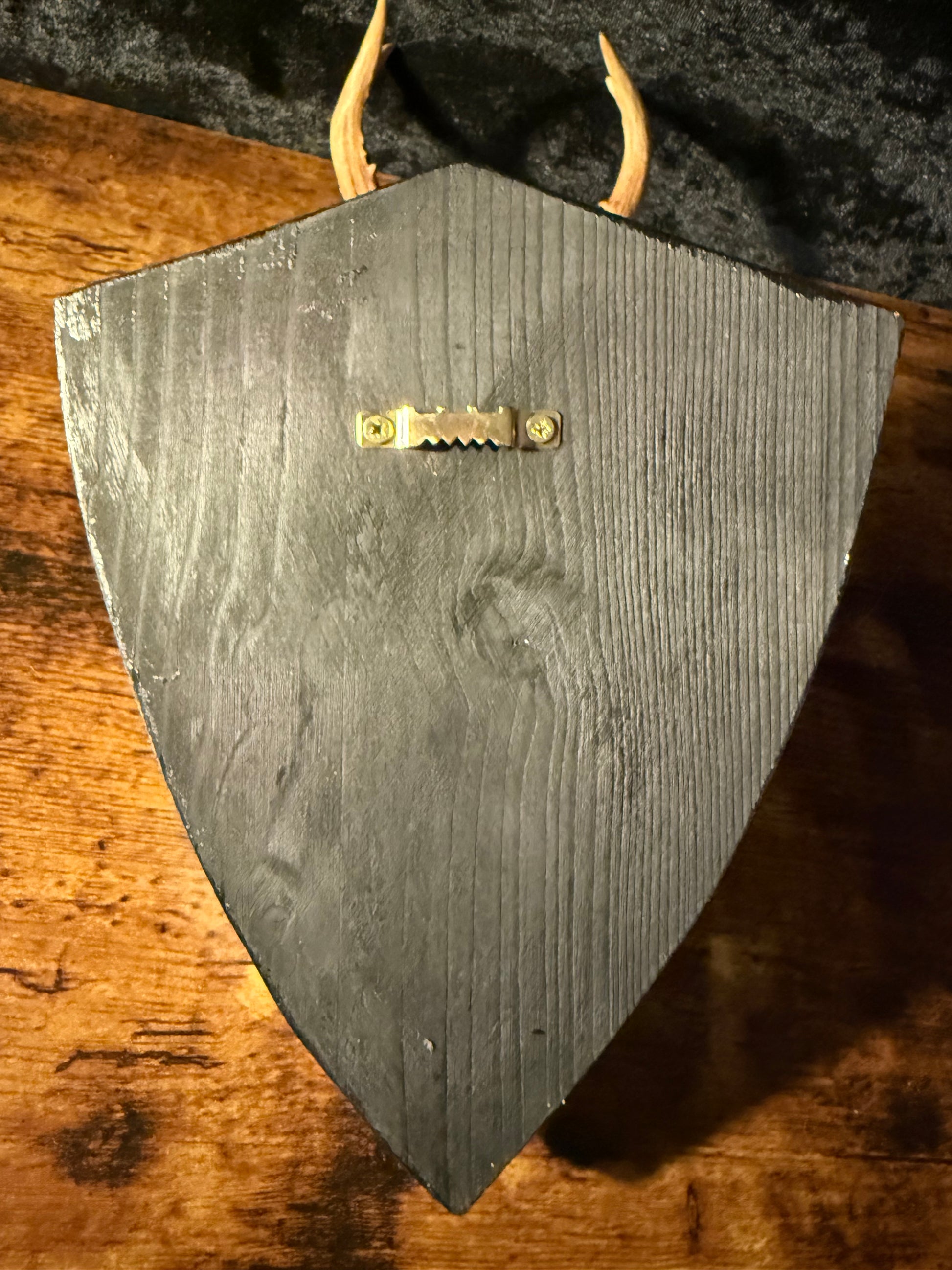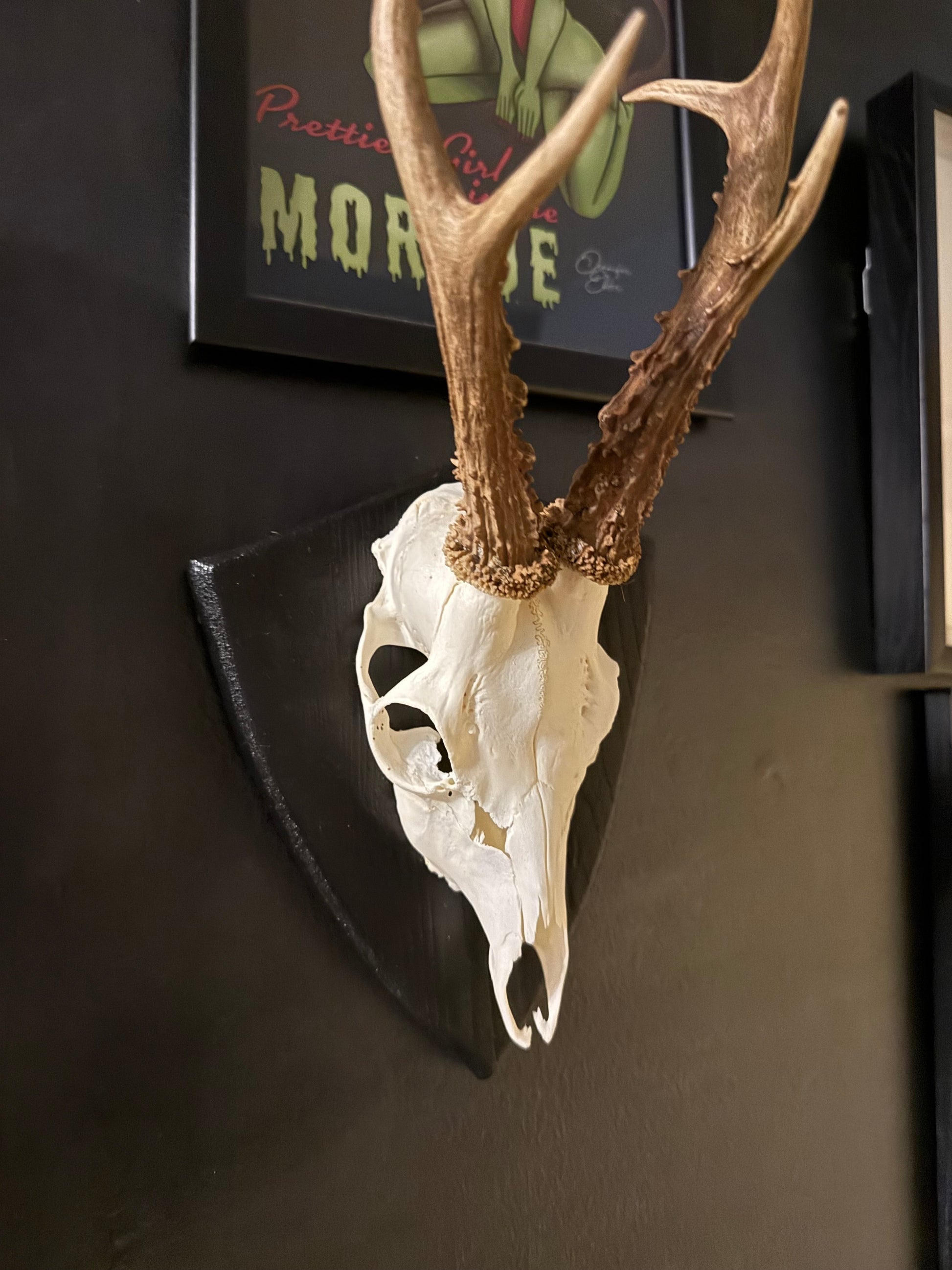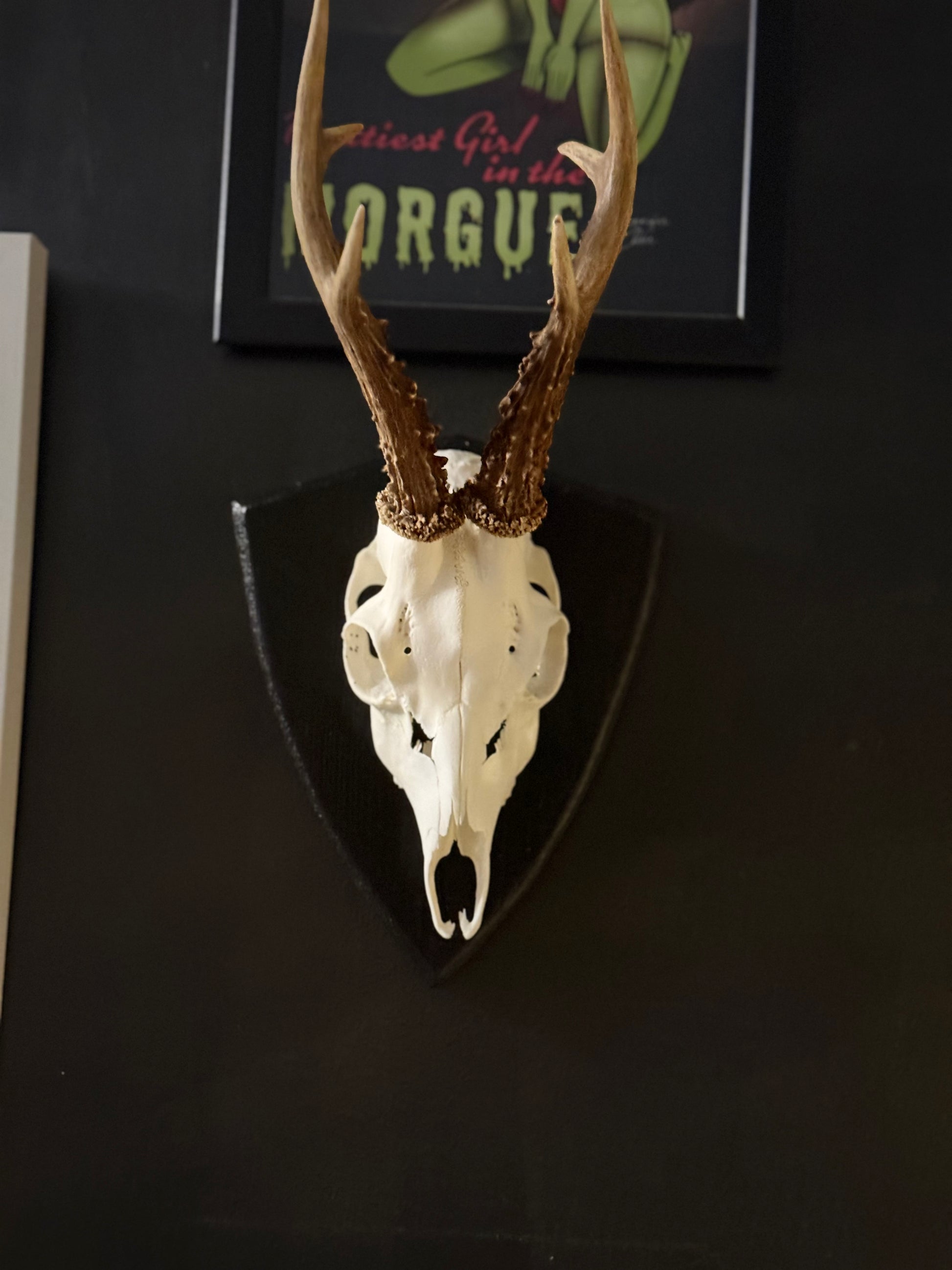 A striking mounted roe deer skull displayed on a deep black gothic shield plaque, creating a dramatic contrast between pale bone and dark wood. This authentic European taxidermy piece brings a gothic aesthetic with natural history appeal, perfect for lovers of the macabre, the mysterious and the curious.