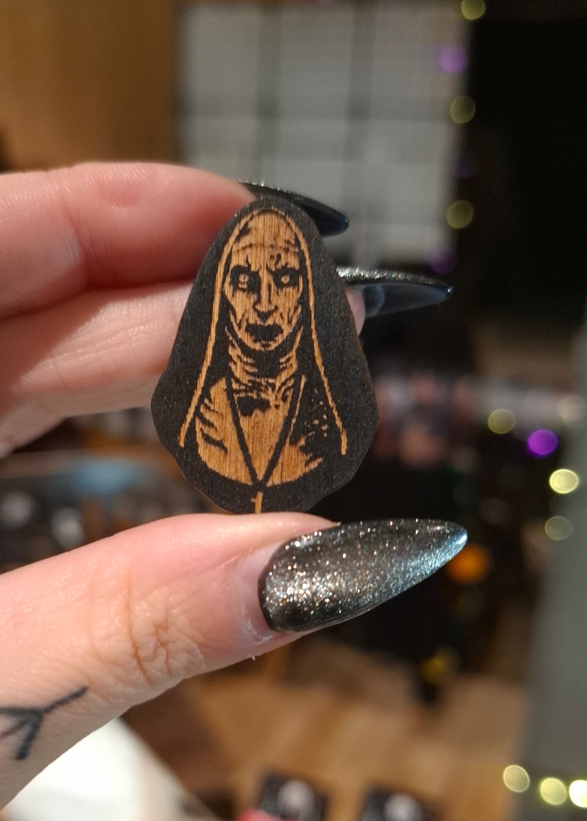Expertly crafted at QK, our Nun Pin Badge is sure to delight horror enthusiasts. Made from engraved wood, the badge measures approximately 3cm, making it a perfect addition to any collection. Enhance your pin game with this unique and chilling accessory.